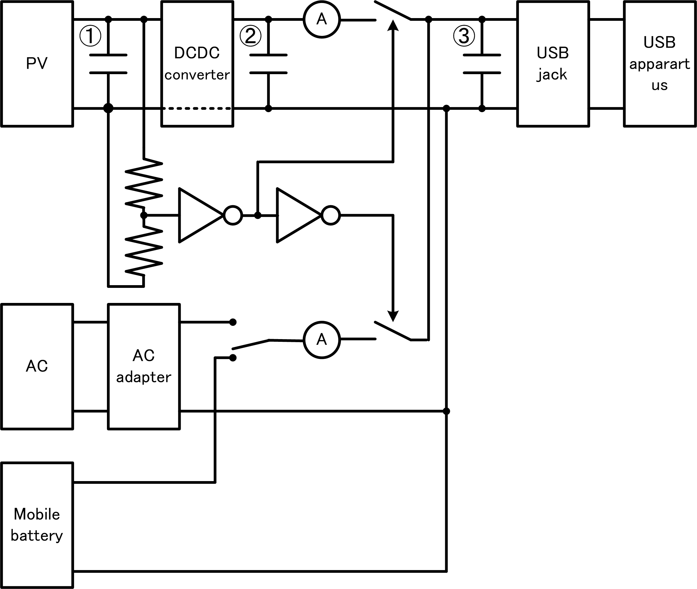 3か所からダイオード経由で電源供給し、電気二重層キャパシタに電気を蓄え、後段をnMOS+抵抗器+pMOSからなるインバータにすることにより、100%に近い時間電源を供給します。