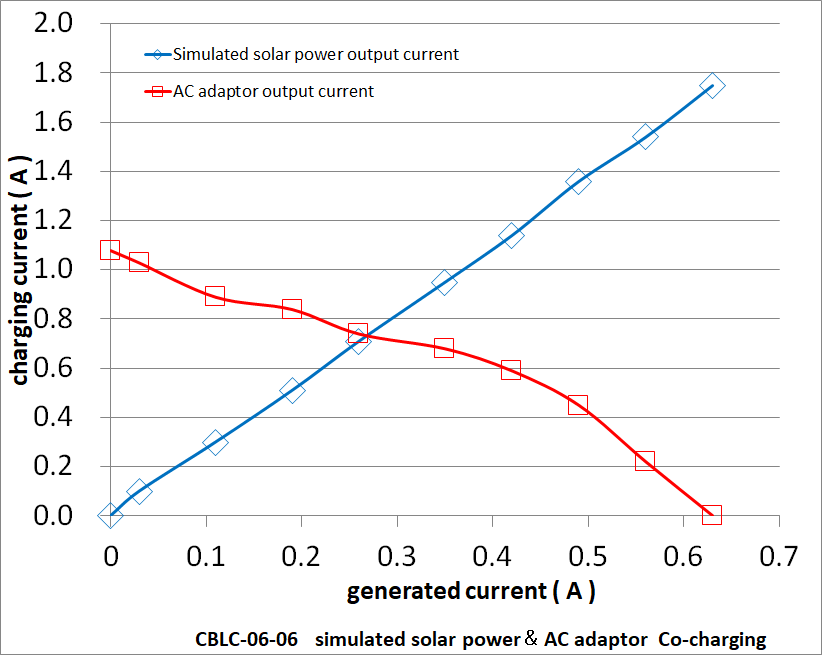 協調充電とは、太陽電池からと、ACアダプタやモバイルバッテリーからとの電力を混ぜ合わせる技術で、フィードバック制御によるもので、その特徴は、太陽電池からの電力を優先的に使い、太陽電池からの電力で足りない部分のみACアダプタやモバイルバッテリーからの電力を使います。